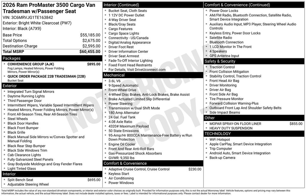 New 2026 RamProMaster PROMASTER 3500 TRADESMAN CARGO VAN HIGH ROOF 159' Cargo Van