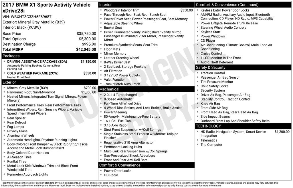 Mineral Grey Metallic 2017 BMW X1 xDrive28i AWD 8-Speed Automatic 2.0L 4-Cylinder DOHC 16V TwinPower Turbo 3.15 Axle Ratio, 4-Wheel Disc Brakes, 7 Speakers, ABS brakes, Advanced Real-Time Traffic Information, Air Conditioning, Alloy wheels, AM/FM radio, Automatic temperature control, BMW Connected App Compatibility, BMW Online & BMW Apps, Brake assist, Bumpers: body-color, CD player, Compass, Delay-off headlights, Driver door bin, Driver vanity mirror, Dual front impact airbags, Dual front side impact airbags, DVD Area Coding (North America), Electronic Stability Control, Emergency communication system: BMW Assist eCall, Fine-Wood 'Fineline' Trim w/Pearl Chrome Accent, Four wheel independent suspension, Front anti-roll bar, Front Bucket Seats, Front Center Armrest, Front dual zone A/C, Front fog lights, Front reading lights, Heated door mirrors, Heated Front Seats, Heated Steering Wheel, Hi-Fi Sound System, Illuminated entry, In-Dash CD Player, Knee airbag, Leather Shift Knob, Low tire pressure warning, Memory seat, Navigation Business, Occupant sensing airbag, Outside temperature display, Overhead airbag, Panic alarm, Panoramic Moonroof, Park Distance Control, Parking Assistant, Passenger door bin, Passenger vanity mirror, Power door mirrors, Power driver seat, Power Front Seats, Power Liftgate, Power passenger seat, Power steering, Power windows, Radio data system, Radio: Professional w/Bluetooth/USB, Rain sensing wipers, Rear anti-roll bar, Rear reading lights, Rear seat center armrest, Rear window defroster, Rear window wiper, Rear-View Camera, Remote keyless entry, Remote Services, Roof rack: rails only, Security system, SensaTec Upholstery, Speed control, Speed-sensing steering, Speed-Sensitive Wipers, Split folding rear seat, Spoiler, Sport steering wheel, Steering wheel mounted audio controls, Tachometer, Telescoping steering wheel, Tilt steering wheel, Traction control, Trip computer, Turn signal indicator mirrors, Variably intermittent wipers, Wheels: 18" x 7.5" Alloy Y Spoke (Style 569), Wheels: 18" x 7.5" Light Alloy Y-Spoke (Style 566).