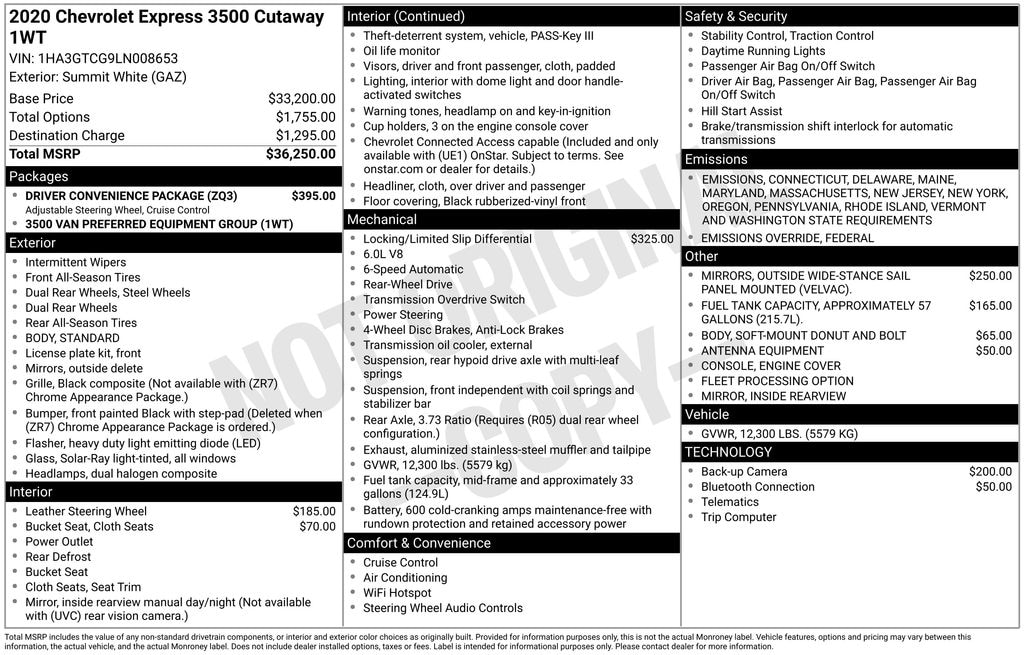 2 Speakers, 3.73 Rear Axle Ratio, 4-Wheel Disc Brakes, ABS brakes, Air Conditioning, AM/FM radio, Antenna Equipment, Bluetooth® For Phone, Body Soft-Mount Donut & Bolt, Cruise Control, Delay-off headlights, Driver & Front Passenger High-Back Bucket Seats, Driver Convenience Package, Driver door bin, Driver's Seat Mounted Armrest, Dual front impact airbags, Dual Rear Wheel Configuration, Dual rear wheels, Electronic Stability Control, Emergency communication system, Engine Cover Console w/Swing-Out Storage Bin, Front anti-roll bar, Front Bucket Seats, Front wheel independent suspension, Fuel Tank Capacity Approx. 57 Gallons (215.7L), Fully automatic headlights, Heavy-Duty Locking Rear Differential, Inside Rearview Mirror w/Rr Vision Camera Display, Leather-Wrapped Steering Wheel, Manual Day/Night Inside Rear-View Mirror, Occupant sensing airbag, Passenger cancellable airbag, Passenger door bin, Passenger seat mounted armrest, Power steering, Preferred Equipment Group 1WT, Radio: AM/FM Stereo w/MP3 Player & Digital Clock, Rear Vision Camera, Reclining High-Back Bucket Seats w/Inboard Armrests, Steering Wheel Mounted Audio Controls, Tachometer, Tilt Steering Wheel, Traction control, Trip computer, Variably intermittent wipers, Vinyl Seat Trim, Voltmeter, Wheels: 16" x 6.5" 8-Lug Painted Steel HD (6), Wide-Stance Sail Panel Mounted Outside Mirrors.