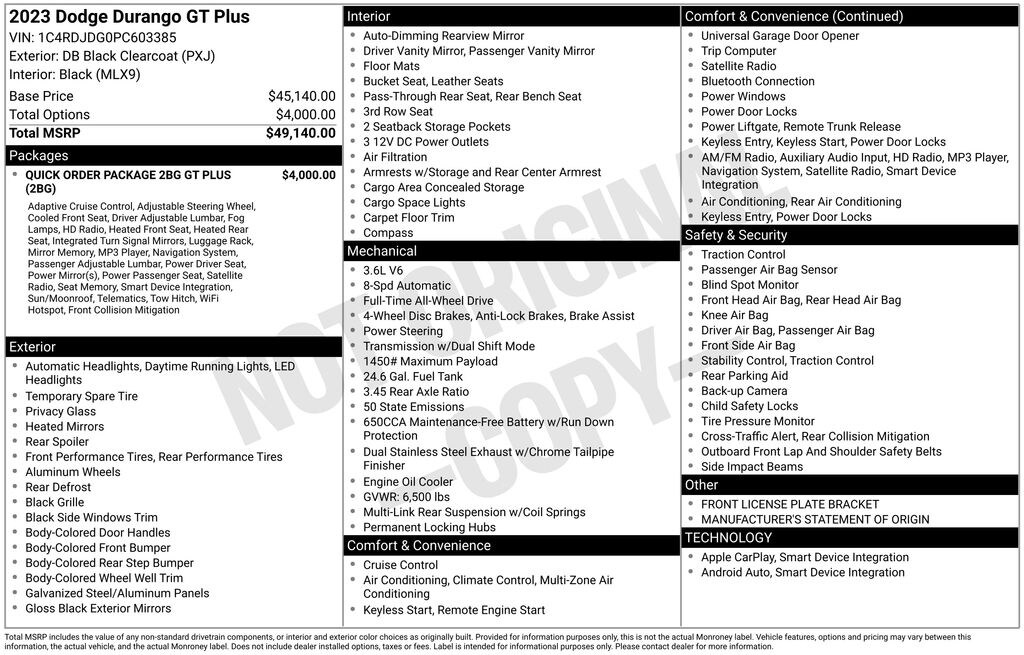 AWD, 1-Year Trial (Registration Required), 10.1" Touchscreen Display, 115V Auxiliary Power Outlet, 180 Amp Alternator, 3.45 Rear Axle Ratio, 3rd row seats: split-bench, 4-Wheel Disc Brakes, 4G LTE Wi-Fi Hot Spot, 6 Speakers, 7 & 4 Pin Wiring Harness, ABS brakes, Adaptive Cruise Control w/Stop, Air Conditioning, Alloy wheels, AM/FM radio: SiriusXM, Apple CarPlay, Apple CarPlay/Android Auto, Auto-Dimming Exterior Driver Mirror, Auto-dimming Rear-View mirror, Automatic temperature control, Black Roof Rails, Brake assist, Bumpers: body-color, Class IV Receiver Hitch, Cloth Bucket Seats w/Shift Insert, Compass, Connected Travel & Traffic Services, Delay-off headlights, Disassociated Touchscreen Display, Driver door bin, Driver vanity mirror, Dual front impact airbags, Dual front side impact airbags, Dual Remote USB Port - Charge Only, Electronic Stability Control, Exterior Mirrors w/Heating Element, Exterior Mirrors w/Memory, Exterior Mirrors w/Supplemental Signals, Floor Console w/Leather Armrest, Four wheel independent suspension, Front anti-roll bar, Front Bucket Seats, Front Center Armrest w/Storage, Front dual zone A/C, Front License Plate Bracket, Front reading lights, Full Speed Forward Collision Warning Plus, Fully automatic headlights, Garage door transmitter, Gloss Black Exterior Mirrors, Google Android Auto, GPS Antenna Input, GPS Navigation, HD Radio, Heated door mirrors, Heated front seats, Heated Second Row Seats, Heated steering wheel, Heavy-Duty Engine Cooling, Illuminated entry, Integrated Center Stack Radio, Integrated Roof Rail Crossbars, Integrated Voice Command w/Bluetooth, Knee airbag, Leather steering wheel, Leather Trimmed Bucket Seats, Leather Wrapped Door Panels, LED Auxiliary Low Beam & Turn Signal, Low tire pressure warning, Manufacturer's Statement of Origin, Occupant sensing airbag, Outside temperature display, Overhead airbag, Overhead console, Panic alarm, ParkView Rear Back-Up Camera, Passenger door bin, Passenger vanity mirror, Power 6x9 Multi-Function Foldaway Mirrors, Power 8-Way Driver Memory 8-Way Passenger Seats, Power door mirrors, Power driver seat, Power Driver/Passenger 4-Way Lumbar Adjust, Power Liftgate, Power steering, Power Sunroof, Power Tilt & Telescopic Steering Column, Power windows, Premium LED Fog Lamps, Quick Order Package 2BG GT Plus, Radio data system, Radio: Uconnect 4 w/8.4" Display, Radio: Uconnect 5 Nav w/10.1" Display, Radio/Driver Seat/Mirrors Memory, Rear air conditioning, Rear anti-roll bar, Rear Load Leveling Suspension, Rear reading lights, Rear seat center armrest, Rear window defroster, Rear window wiper, Red Accent Stitching, Remote keyless entry, SiriusXM Guardian - Included Trial (B), SiriusXM Radio Service, SiriusXM Satellite Radio, SiriusXM w/360L, Speed control, Speed-sensing steering, Speed-Sensitive Wipers, Split folding rear seat, Spoiler, Sport steering wheel, Steering wheel mounted audio controls, Tachometer, Telescoping steering wheel, Tilt steering wheel, Traction control, Trailer Brake Control, Trip computer, USB Host Flip, Variably intermittent wipers, Ventilated Front Seats, Voltmeter, Wheels: 20" x 8.0" Fine Silver, AWD.