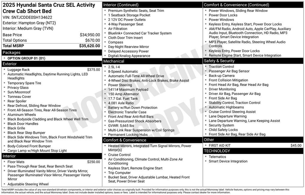 18" x 7.5J Alloy Wheels, 4-Wheel Disc Brakes, 4.081 Axle Ratio, 6 Speakers, ABS brakes, Air Conditioning, All Season Fitted Liners, Alloy wheels, AM/FM radio: SiriusXM, Apple CarPlay & Android Auto, Auto High-beam Headlights, Auto-leveling suspension, Automatic temperature control, Brake assist, Bumpers: body-color, Compass, Cross Rails, Delay-off headlights, Driver door bin, Driver vanity mirror, Dual front impact airbags, Dual front side impact airbags, Electronic Stability Control, Emergency communication system: Bluelink+, Exterior Parking Camera Rear, First Aid Kit, Four wheel independent suspension, Front anti-roll bar, Front Bucket Seats, Front Center Armrest, Front dual zone A/C, Front reading lights, Fully automatic headlights, H-Tex Leatherette Seat Trim, Heated door mirrors, Heated Front Bucket Seats, Heated front seats, Illuminated entry, Low tire pressure warning, Occupant sensing airbag, Option Group 01, Outside temperature display, Overhead airbag, Overhead console, Panic alarm, Passenger door bin, Passenger vanity mirror, Power door mirrors, Power driver seat, Power moonroof, Power steering, Power windows, Radio data system, Radio: AM/FM/HD Audio System, Rear anti-roll bar, Rear reading lights, Rear seat center armrest, Rear side impact airbag, Rear step bumper, Rear window defroster, Remote keyless entry, Security system, Speed control, Speed-sensing steering, Split folding rear seat, Spoiler, Steering wheel mounted audio controls, Tachometer, Telescoping steering wheel, Tilt steering wheel, Traction control, Trip computer, Turn signal indicator mirrors, Variably intermittent wipers.