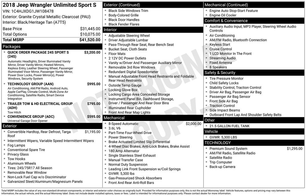 1-Yr SiriusXM Radio Service, 240 Amp Alternator, 7 & 4 Pin Wiring Harness, 7.0" Touchscreen Display, 700 Amp Maintenance Free Battery, Air Conditioning w/Auto Temperature Control, Air Filtering, Apple CarPlay, Automatic Headlamps, Auxiliary Switches, Class II Receiver Hitch, Cluster 7.0" TFT Color Display, Convenience Group, Deep Tint Sunscreen Windows, For More Info, Call 800-643-2112, Front 1-Touch Down Power Windows, Google Android Auto, GPS Antenna Input, Integrated Center Stack Radio, Leather Wrapped Steering Wheel, Power Heated Mirrors, Quick Order Package 24S Sport S, Radio: Uconnect 4 w/7" Display, Remote Keyless Entry, Security Alarm, SiriusXM Satellite Radio, Speed Sensitive Power Locks, Sun Visors w/Illuminated Vanity Mirrors, Technology Group, Trailer Tow & HD Electrical Group, Universal Garage Door Opener, USB Host Flip, Wheels: 17" x 7.5" Tech Silver Aluminum, 21.5 Gallon Fuel Tank (DISC), 220 Amp Alternator, 3.45 Rear Axle Ratio, 4-Wheel Disc Brakes, 8 Speakers, ABS brakes, Air Conditioning, Alpine Premium Audio System, AM/FM radio, Black 3-Piece Hard Top, Brake assist, Cloth Low-Back Bucket Seats, Compass, Delay-off headlights, Driver door bin, Driver vanity mirror, Dual front impact airbags, Dual front side impact airbags, Electronic Stability Control, Freedom Panel Storage Bag, Front anti-roll bar, Front Bucket Seats, Front Center Armrest w/Storage, Front fog lights, Front reading lights, Integrated roll-over protection, Low tire pressure warning, Non-Lock Fuel Cap w/o Discriminator, Normal Duty Suspension, Occupant sensing airbag, Outside temperature display, ParkView Rear Back-Up Camera, Passenger door bin, Passenger vanity mirror, Power steering, Radio data system, Radio: Uconnect 3 w/5" Display, Rear anti-roll bar, Rear reading lights, Rear Window Defroster, Rear Window Wiper/Washer, Speed control, Split folding rear seat, Steering wheel mounted audio controls, Tachometer, Telescoping steering wheel, Tilt steering wheel, Traction control, Trip computer, Variably intermittent wipers, Wheels: 17" x 7.5" Black Steel Styled, 1-Yr SiriusXM Radio Service, 240 Amp Alternator, 7 & 4 Pin Wiring Harness, 7.0" Touchscreen Display, 700 Amp Maintenance Free Battery, Air Conditioning w/Auto Temperature Control, Air Filtering, Apple CarPlay, Automatic Headlamps, Auxiliary Switches, Class II Receiver Hitch, Cluster 7.0" TFT Color Display, Convenience Group, Deep Tint Sunscreen Windows, For More Info, Call 800-643-2112, Front 1-Touch Down Power Windows, Google Android Auto, GPS Antenna Input, Integrated Center Stack Radio, Leather Wrapped Steering Wheel, Power Heated Mirrors, Quick Order Package 24S Sport S, Radio: Uconnect 4 w/7" Display, Remote Keyless Entry, Security Alarm, SiriusXM Satellite Radio, Speed Sensitive Power Locks, Sun Visors w/Illuminated Vanity Mirrors, Technology Group, Trailer Tow & HD Electrical Group, Universal Garage Door Opener, USB Host Flip, Wheels: 17" x 7.5" Tech Silver Aluminum.