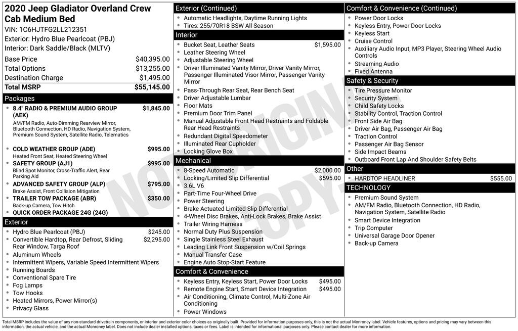 Stand out on and off the road with this 2020 Jeep Gladiator Overland 4WD, a show-stopping truck finished in Hydro Blue Pearlcoat with a color-matched hard top! This Gladiator is loaded with premium upgrades built for adventure, style, and serious off-road performance.