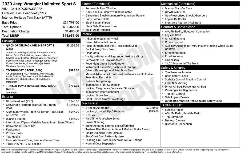 Adventure meets style in this 2020 Jeep Wrangler Unlimited Sport S 4WD a head-turning off-road icon finished in stunning Bikini Pearlcoat! Backed by a Clean CARFAX and equipped with a Hard Top, this Wrangler is ready for every season and every trail.