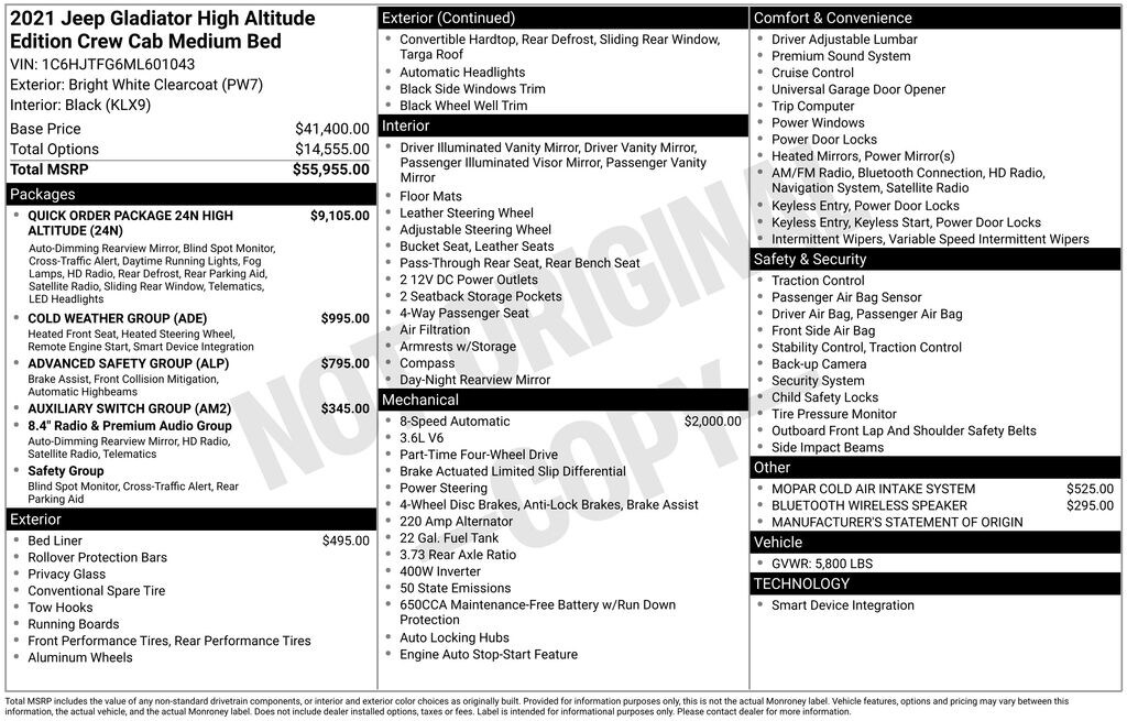 1-Year SiriusXM Guardian Trial, 110 mph Vehicle Max Speed Calibration, 240 Amp Alternator, 3.73 Rear Axle Ratio, 4-Wheel Disc Brakes, 400W Inverter, 5-Year SiriusXM Traffic Service, 5-Year SiriusXM Travel Link Service, 700 Amp Maintenance Free Battery, 8 Speakers, 8.4" Radio & Premium Audio Group, 8.4" Touchscreen Display, ABS brakes, Advanced Brake Assist, Advanced Safety Group, Air Conditioning, Alloy wheels, Alpine Premium Audio System, AM/FM radio: SiriusXM, Apple CarPlay/Android Auto, Auto High Beam Headlamp Control, Auto-Dimming Rear-View Mirror, Automatic temperature control, Auxiliary Switch Group, Auxiliary Switches, Blind Spot & Cross Path Detection, Bluetooth Wireless Speaker, Body Color 3-Piece Hard Top, Body Color Exterior Mirrors, Body Color Front Bumper, Body Color Grille w/Gloss Black Rings, Body Color Rear Bumper w/Step Pads, Body-Color Door & Tailgate Handles, Brake assist, Caramel Interior Accents, Cold Weather Group, Compass, Dana M210 Wide Front Axle, Dana M220 Wide Rear Axle, Daytime Running Lamps LED Accents, Delay-off headlights, Driver door bin, Driver vanity mirror, Dual front impact airbags, Dual front side impact airbags, Electronic Stability Control, Emergency/Assistance Call, For Details, Visit DriveUconnect.com, Freedom Panel Storage Bag, Front anti-roll bar, Front Bucket Seats, Front Center Armrest w/Storage, Front dual zone A/C, Front fog lights, Front LED Fog Lamps, Front reading lights, Full Body Color Fender Flares, Full Length Floor Console Premium Armrest, Full Speed Forward Collision Warning Plus, Fully automatic headlights, Garage door transmitter, GPS Navigation, HD Radio, Heated door mirrors, Heated Front Seats, Heated Steering Wheel, High Altitude Package, Illuminated entry, Integrated roll-over protection, Leather steering wheel, Leather Wrapped Park Brake Handle, Leather Wrapped Shift Knob, Leather-Trimmed Bucket Seats, LED Lighting Group, LED Park Turn Lamps, LED Premium Reflector Headlamps, LED Taillamps, Low tire pressure warning, Manufacturer's Statement of Origin, MOPAR Cold Air Intake System, MOPAR Spray In Bedliner, No Soft Top, Normal Duty Plus Suspension, Occupant sensing airbag, Outside temperature display, Overland Cloth Bucket Seats, Panic alarm, ParkSense Rear Park Assist System, ParkView Rear Back-Up Camera, Passenger door bin, Passenger vanity mirror, Power door mirrors, Power steering, Power windows, Premium Dark Exterior Accents, Premium Door Trim Panel, Quick Order Package 24N High Altitude, Radio data system, Radio: Uconnect 4 w/7" Display, Radio: Uconnect 4C Nav w/8.4" Display, Rear anti-roll bar, Rear Armrest w/Cupholder Seat, Rear reading lights, Rear Sliding Window, Rear Window Defroster, Remote keyless entry, Remote Proximity Keyless Entry, Remote Start System, Safety Group, Security system, SiriusXM Traffic Plus, SiriusXM Travel Link, Speed control, Split folding rear seat, Sport Front Shock Absorbers, Sport Rear Shock Absorbers, Sport Suspension, Steering wheel mounted audio controls, Tachometer, Telescoping steering wheel, Tilt steering wheel, Traction control, Trip computer, Variably intermittent wipers, Voltmeter, Wheels: 18" x 7.5" Granite Crystal Aluminum, Wheels: 20" x 8" Gloss Black Aluminum, Wrapped I/P Bezel w/Caramel Stitch.