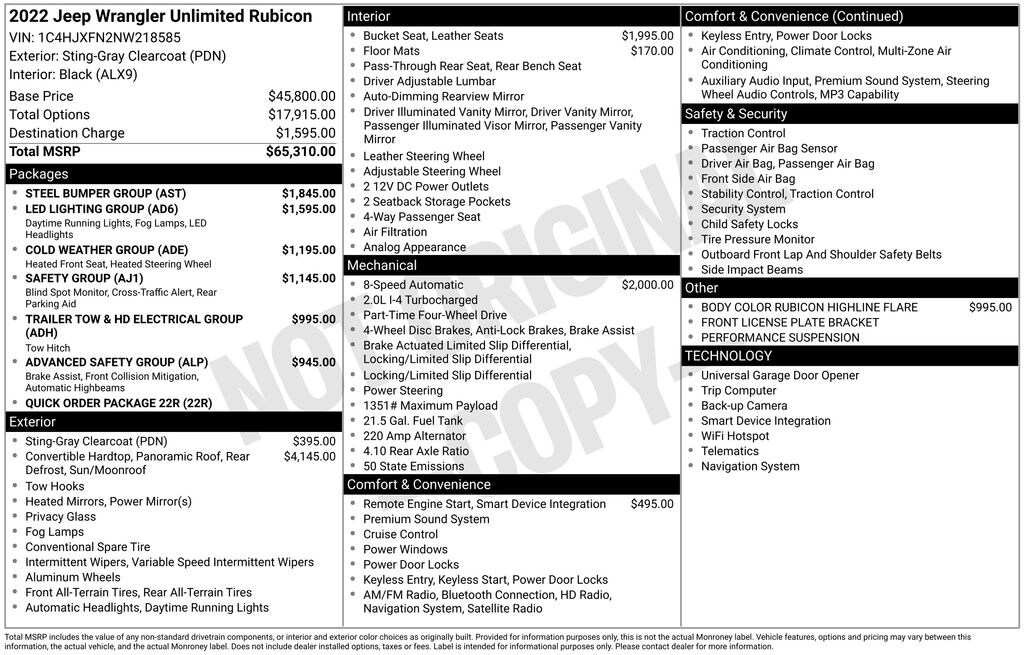 Sting-Gray Clearcoat 2022 Jeep Wrangler Unlimited Rubicon 4WD 8-Speed Automatic 2.0L I4 DOHC 240 Amp Alternator, 4-Wheel Disc Brakes, 4.10 Rear Axle Ratio, 7 & 4 Pin Wiring Harness, 700 Amp Maintenance Free Battery, 9 Speakers, ABS brakes, Advanced Brake Assist, Advanced Safety Group, Air Conditioning, Alloy wheels, AM/FM radio: SiriusXM, Apple CarPlay/Android Auto, Auto High Beam Headlamp Control, Auto-dimming Rear-View mirror, Automatic temperature control, Aux Battery, Auxiliary Switches, Blind Spot & Cross Path Detection, Body Color Rubicon Highline Flare, Brake assist, Class II Receiver Hitch, Cold Weather Group, Compass, Daytime Running Lamps LED Accents, Delay-off headlights, Driver door bin, Driver vanity mirror, Dual front impact airbags, Dual front side impact airbags, Electronic Stability Control, Emergency communication system: SiriusXM Guardian, Engine Oil Cooler, Front anti-roll bar, Front Bucket Seats, Front Center Armrest w/Storage, Front dual zone A/C, Front fog lights, Front LED Fog Lamps, Front License Plate Bracket, Front reading lights, Full Speed Forward Collision Warning Plus, Fully automatic headlights, Garage door transmitter, Heated door mirrors, Heated Front Seats, Heated Steering Wheel, Illuminated entry, Integrated roll-over protection, Leather steering wheel, LED Lighting Group, LED Premium Reflector Headlamps, LED Taillamps, Low tire pressure warning, MOPAR All-Weather Floor Mats, Navigation System, Non-Lock Fuel Cap w/o Discriminator, Occupant sensing airbag, Outside temperature display, Panic alarm, ParkSense Rear Park Assist System, ParkView Rear Back-Up Camera, Passenger door bin, Passenger vanity mirror, Performance Suspension, Power door mirrors, Power steering, Power Top Quarter Window Storage Bag, Power windows, Premium Cloth Low-Back Bucket Seats, Quick Order Package 22R, Radio data system, Radio: Uconnect 4C Nav w/8.4" Display, Rear anti-roll bar, Rear reading lights, Rear Window Defroster, Rear Window Wiper/Washer, Remote keyless entry, Remote Start System, Removable Rear Quarter Windows, Safety Group, Security system, Sky 1-Touch Power Top, Speed control, Split folding rear seat, Steel Bumper Group, Steel Front Bumper, Steel Rear Bumper, Steering wheel mounted audio controls, Stop-Start Dual Battery System, Tachometer, Telescoping steering wheel, Tilt steering wheel, Traction control, Trailer Tow & HD Electrical Group, Trip computer, Variably intermittent wipers, Voltmeter, Wheels: 17" x 7.5" Machined w/Black Pockets.