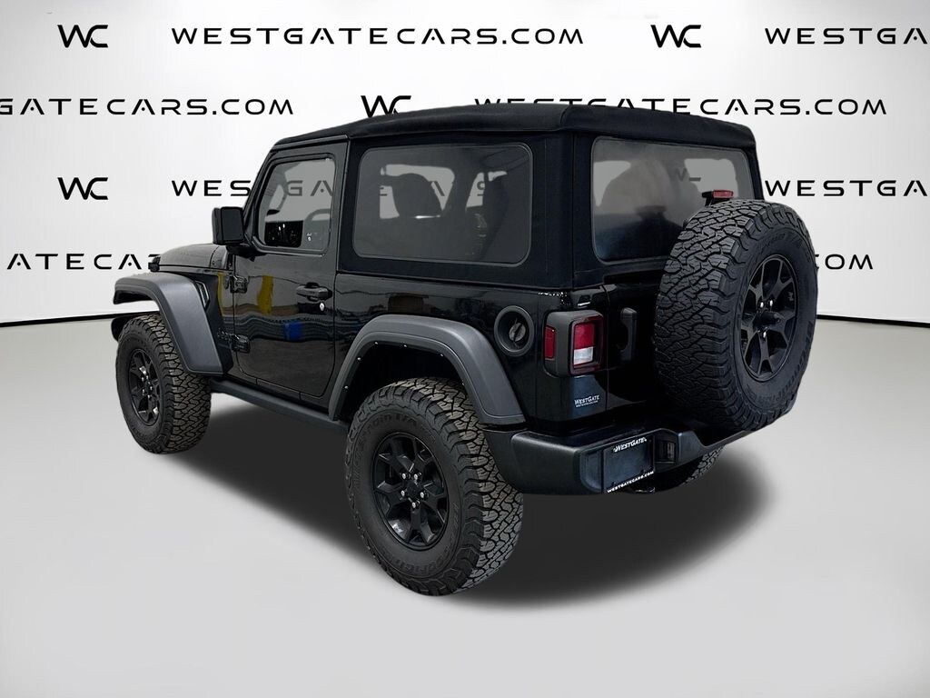 4-Wheel Drive Swing Gate Decal, 7.0" Touchscreen Display, 97 MPH Vehicle Max Speed Calibration, Air Conditioning, Anti-Spin Differential Rear Axle, Apple CarPlay, Automatic Headlamps, Black Grille, Black Trail Rated Badge, Bridgestone Brand Tires, Deep Tint Sunscreen Windows, Front 1-Touch Down Power Windows, Front LED Fog Lamps, Global Telematics Box Module (TBM), Google Android Auto, GPS Antenna Input, Integrated Center Stack Radio, Integrated Voice Command w/Bluetooth, Leather Wrapped Steering Wheel, LED Headlamp & Fog Lamp Group, LED Premium Reflector Headlamps, Matte Black Jeep Badge, Mold In Color Bumper w/Gloss Black, MOPAR All-Weather Floor Mats, Power Heated Mirrors, Quick Order Package 24W Willys, R1234YF A/C Refrigerant, Radio: Uconnect 4 w/7" Display, Remote Keyless Entry, Security Alarm, SiriusXM Guardian-Included Trial (B), Speed Sensitive Power Locks, Sun Visors w/Illuminated Vanity Mirrors, USB Host Flip, Wheels: 17" x 7.5" Moab Black Aluminum, Willys, Willys Hood Decal, 3.45 Overall Top Gear Ratio, 4-Wheel Disc Brakes, 8 Speakers, ABS brakes, AM/FM radio, Auxiliary Battery, Brake assist, Cloth Low-Back Bucket Seats, Compass, Corning Gorilla Glass, Delay-off headlights, Driver door bin, Driver vanity mirror, Dual front impact airbags, Dual front side impact airbags, Electronic Stability Control, Emergency communication system: SiriusXM Guardian, Engine Oil Cooler, Front anti-roll bar, Front Bucket Seats, Front Center Armrest w/Storage, Front fog lights, Front reading lights, Integrated roll-over protection, Low tire pressure warning, Non-Locking Fuel Cap w/o Discriminator, Normal Duty Suspension, Occupant sensing airbag, Outside temperature display, ParkView Rear Back-Up Camera, Passenger door bin, Passenger vanity mirror, Power steering, Premium Black Sunrider Soft Top, Radio data system, Radio: Uconnect 3 w/5" Display, Rear anti-roll bar, Rear reading lights, Speed control, Start-Stop Dual Battery System, Steering wheel mounted audio controls, Tachometer, Telescoping steering wheel, Tilt steering wheel, Traction control, Trip computer, Variably intermittent wipers, Wheels: 17" x 7.5" Black Steel Styled, 4-Wheel Drive Swing Gate Decal, 7.0" Touchscreen Display, 97 MPH Vehicle Max Speed Calibration, Air Conditioning, Anti-Spin Differential Rear Axle, Apple CarPlay, Automatic Headlamps, Black Grille, Black Trail Rated Badge, Bridgestone Brand Tires, Deep Tint Sunscreen Windows, Front 1-Touch Down Power Windows, Front LED Fog Lamps, Global Telematics Box Module (TBM), Google Android Auto, GPS Antenna Input, Integrated Center Stack Radio, Integrated Voice Command w/Bluetooth, Leather Wrapped Steering Wheel, LED Headlamp & Fog Lamp Group, LED Premium Reflector Headlamps, Matte Black Jeep Badge, Mold In Color Bumper w/Gloss Black, MOPAR All-Weather Floor Mats, Power Heated Mirrors, Quick Order Package 24W Willys, R1234YF A/C Refrigerant, Radio: Uconnect 4 w/7" Display, Remote Keyless Entry, Security Alarm, SiriusXM Guardian-Included Trial (B), Speed Sensitive Power Locks, Sun Visors w/Illuminated Vanity Mirrors, USB Host Flip, Wheels: 17" x 7.5" Moab Black Aluminum, Willys, Willys Hood Decal.