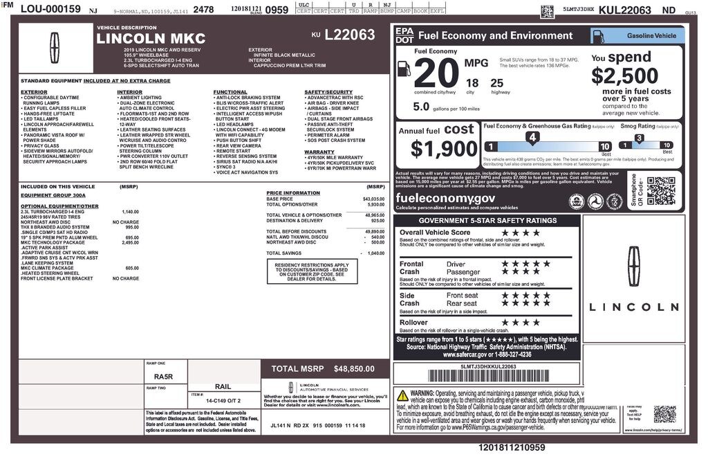 Black 2019 Lincoln MKC Reserve AWD 6-Speed Automatic 2.3L Turbocharged 10 Speakers, 3.51 Axle Ratio, 4-Wheel Disc Brakes, ABS brakes, Active Park Assist, Adaptive Cruise Control, Adaptive suspension, Air Conditioning, Alloy wheels, AM/FM radio: SiriusXM, AppLink/Apple CarPlay and Android Auto, Auto High Beams, Auto tilt-away steering wheel, Auto-dimming Rear-View mirror, Automatic temperature control, Brake assist, Bumpers: body-color, CD player, Compass, Delay-off headlights, Driver door bin, Driver vanity mirror, Dual front impact airbags, Dual front side impact airbags, Electrochromic Rearview Mirror w/CADS Support, Electronic Stability Control, Emergency communication system: SYNC 3 911 Assist, Enhanced THX II Certified Audio System, Equipment Group 300A, Exterior Parking Camera Rear, Forward Sensing System, Four wheel independent suspension, Front anti-roll bar, Front Bucket Seats, Front Center Armrest, Front dual zone A/C, Front fog lights, Front reading lights, Fully automatic headlights, Garage door transmitter, Genuine wood dashboard insert, Genuine wood door panel insert, HD Radio, Heated door mirrors, Heated front seats, Heated Rear Seats, Heated Steering Wheel, Illuminated entry, Knee airbag, Lane Keeping System, Lincoln MKC Climate Package, Lincoln MKC Technology Package, Low tire pressure warning, Memory seat, Navigation System, Occupant sensing airbag, Outside temperature display, Overhead airbag, Overhead console, Panic alarm, Passenger door bin, Passenger vanity mirror, Power door mirrors, Power driver seat, Power Liftgate, Power moonroof: Vista Roof, Power passenger seat, Power steering, Power windows, Pre-Collision Warning w/Pedestrian Detection, Prem Heated & Cooled Leather-Trimmed Bucket Seats, Radio data system, Radio: Audio System w/Single CD/MP3/Navigation, Rain Sensing Wipers, Rear anti-roll bar, Rear reading lights, Rear seat center armrest, Rear window defroster, Rear window wiper, Remote keyless entry, Roof rack: rails only, Security system, SiriusXM Radio, Speed control, Speed-sensing steering, Speed-Sensitive Wipers, Split folding rear seat, Spoiler, Steering wheel memory, Steering wheel mounted audio controls, SYNC 3 Communications & Entertainment System, Tachometer, Telescoping steering wheel, Tilt steering wheel, Traction control, Trip computer, Turn signal indicator mirrors, Variably intermittent wipers, Ventilated front seats, Wheels: 18" Machined w/Dark Prem Painted Pockets, Wheels: 19" Premium Painted 5-Spoke Aluminum, Windshield Wiper De-Icer.