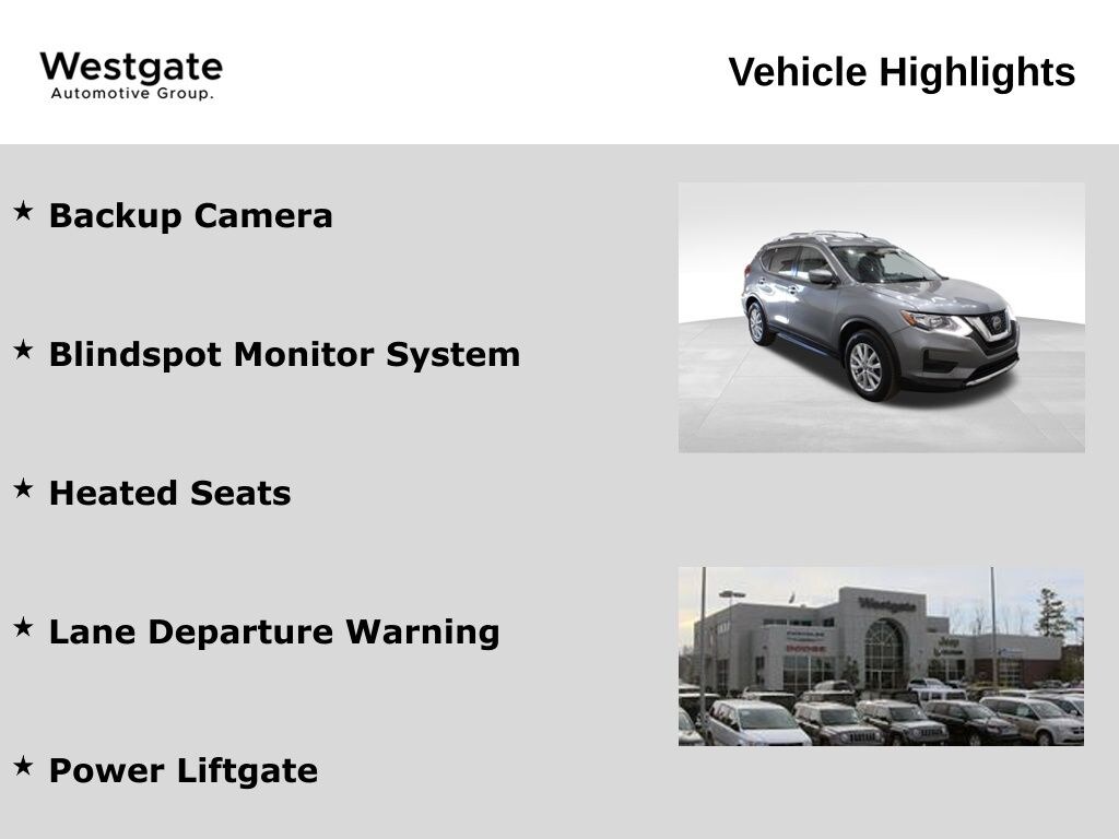 Backup Camera, Blindspot Monitor System, Heated Seats, Lane Departure Warning, Power Liftgate, 17" Aluminum Alloy Wheels, 4-Wheel Disc Brakes, 6 Speakers, 6.386 Axle Ratio, ABS brakes, Air Conditioning, Alloy wheels, AM/FM radio: SiriusXM, Anti-whiplash front head restraints, Auto High-beam Headlights, Automatic temperature control, Black Splash Guards (Set of 4), Blind Spot Warning, Brake assist, Bumpers: body-color, CD player, Chrome Rear Bumper Protector, Cloth Seat Trim, Delay-off headlights, Driver door bin, Driver vanity mirror, Dual front impact airbags, Dual front side impact airbags, Electronic Stability Control, First Aid Kit, Floor Mats & 2-PC Cargo Area Protector, Four wheel independent suspension, Frameless Rearview Mirror w/Universal Remote, Front anti-roll bar, Front Bucket Seats, Front Center Armrest w/Storage, Front dual zone A/C, Front reading lights, Fully automatic headlights, Heated door mirrors, Heated Front Bucket Seats, Heated front seats, Illuminated entry, Illuminated Kick Plates, Lane Departure Warning System, Leather Shift Knob, Low tire pressure warning, NissanConnect featuring Apple CarPlay and Android Auto, Occupant sensing airbag, Outside temperature display, Overhead airbag, Overhead console, Panic alarm, Passenger door bin, Passenger vanity mirror, Power door mirrors, Power driver seat, Power Liftgate, Power steering, Power windows, Radio data system, Radio: AM/FM/CD/AUX, Radio: AM/FM/CD/AUX NissanConnect w/Navigation, Rear anti-roll bar, Rear Parking Sensors, Rear seat center armrest, Rear USB Ports, Rear window defroster, Rear window wiper, Remote keyless entry, Retractable Cargo Cover, Roof rack: rails only, Roof Rail Cross Bars, Security system, Speed control, Speed-sensing steering, Split folding rear seat, Spoiler, Steering wheel mounted audio controls, Tachometer, Telescoping steering wheel, Tilt steering wheel, Traction control, Trip computer, Turn signal indicator mirrors, Variably intermittent wipers.