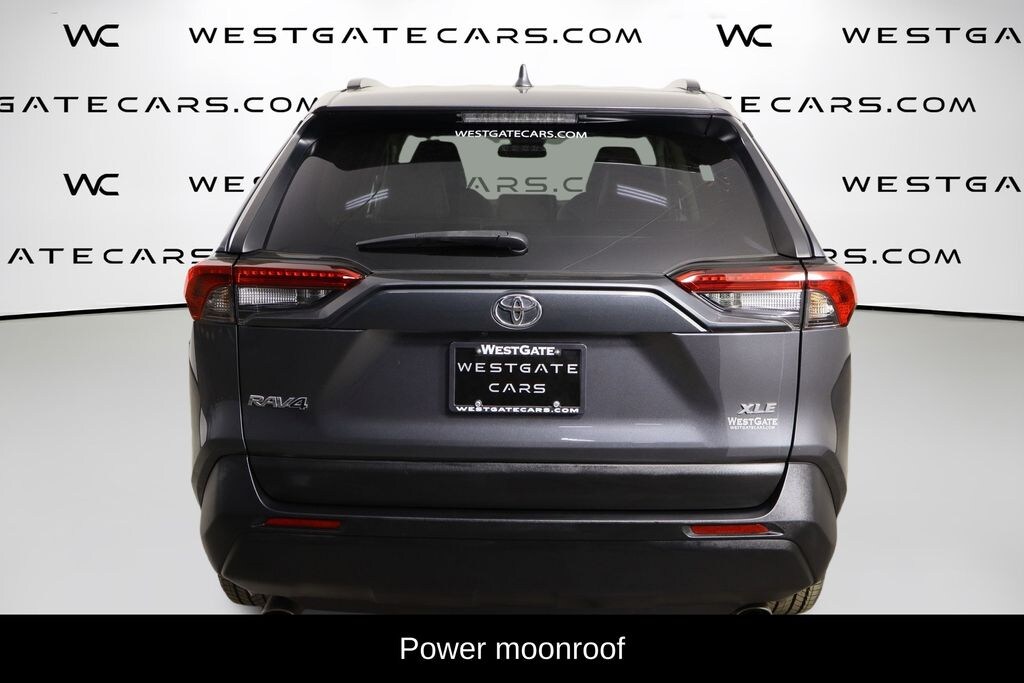 The exterior of this RAV4 is adorned in a sleek Gray color, complemented by the striking 19" 5-Spoke Silver Alloy wheels and a power moonroof that lets in natural light and fresh air. Inside, the cabin is outfitted with premium SofTex seat trim, providing both comfort and style.
